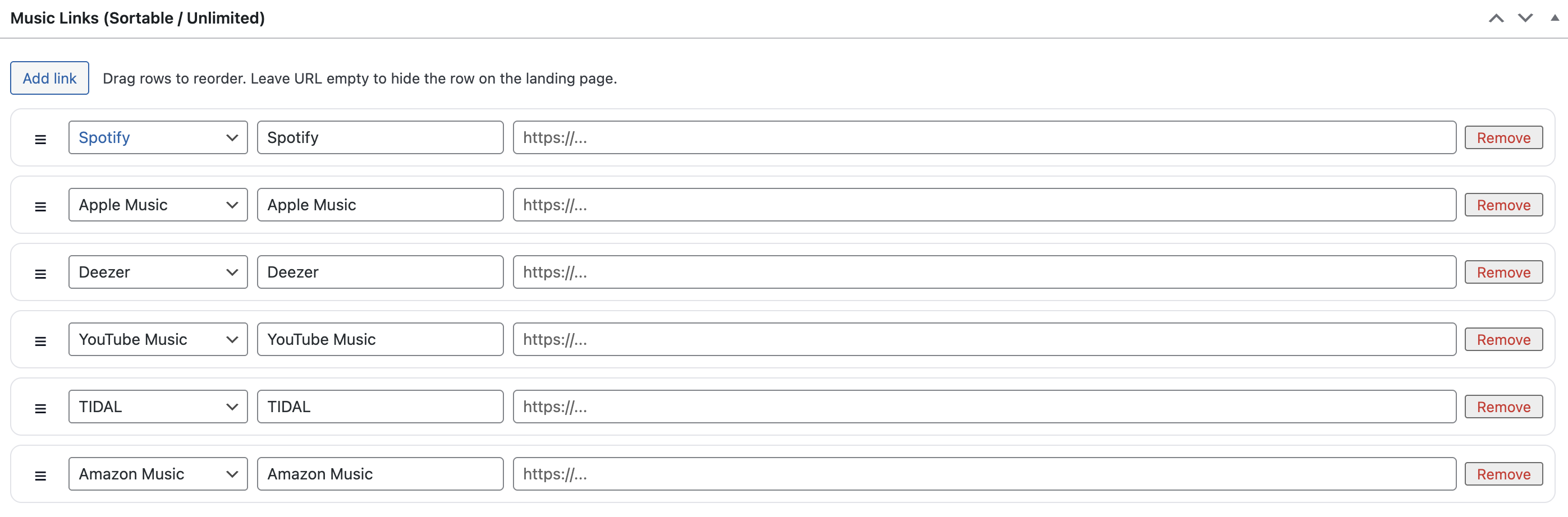 - Predefined major music streaming and download platforms (Spotify, Apple Music, YouTube, Amazon, Bandcamp, and more)