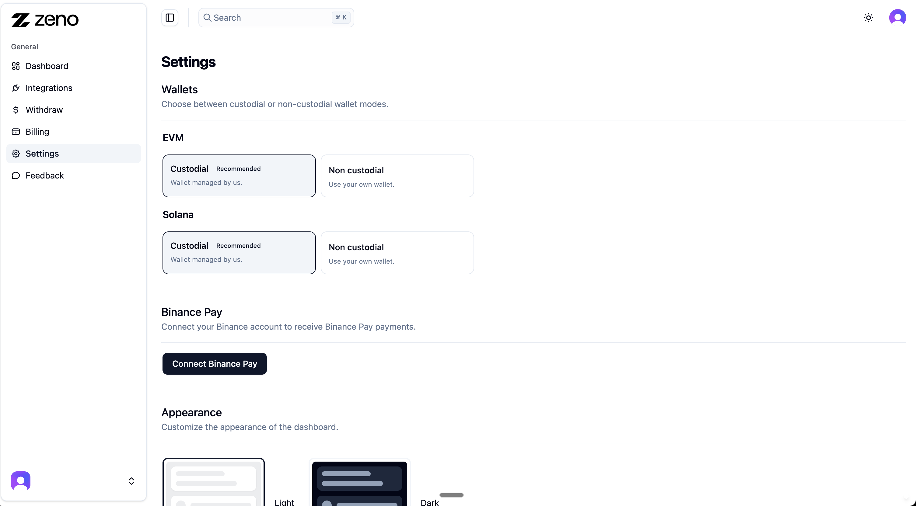 For On Chain payments (Arbitrum, Base, Ethereum, etc.), choose between Custodial and Non Custodial mode.