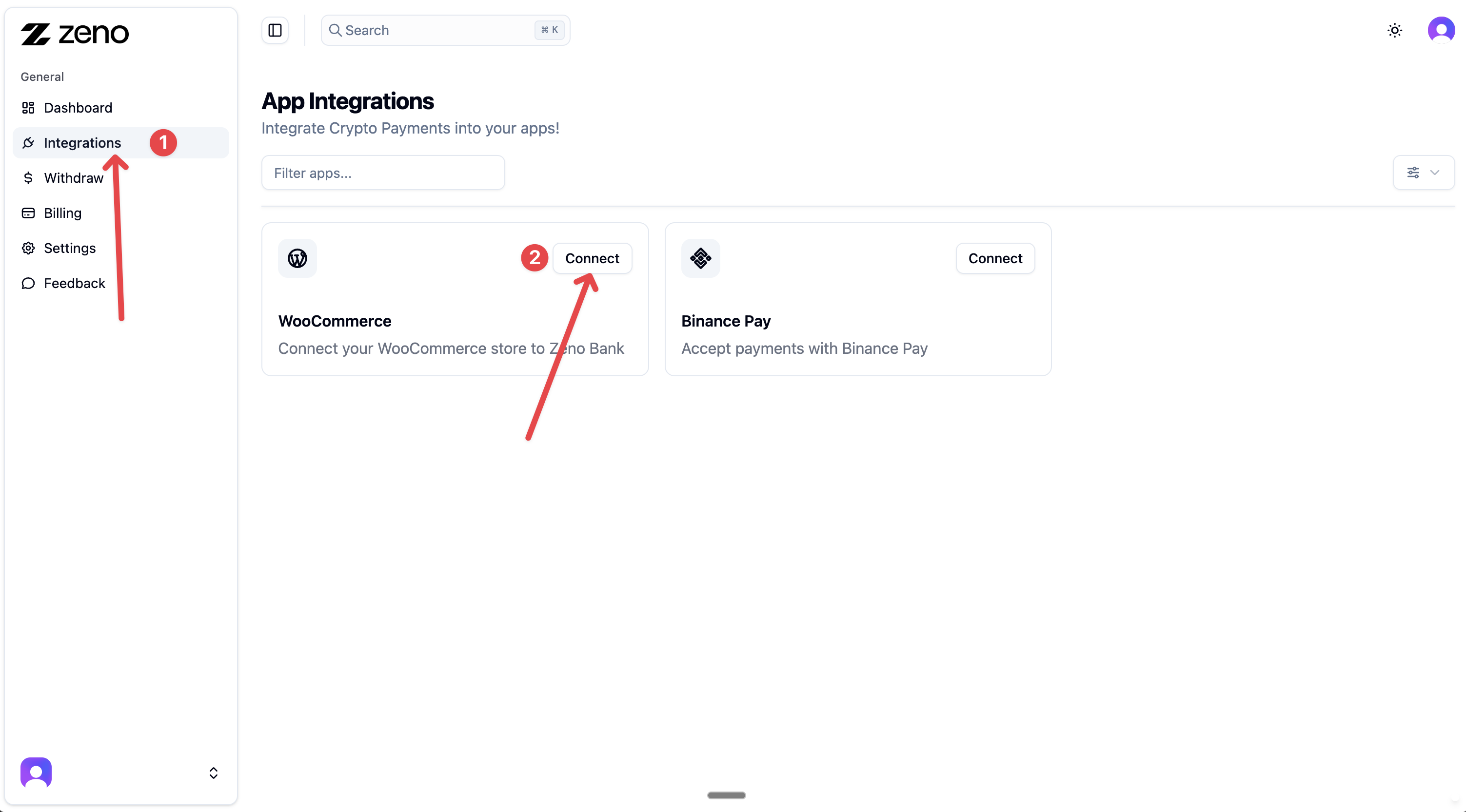 - In your dashboard, go to Integrations WooCommerce, and click Connect.